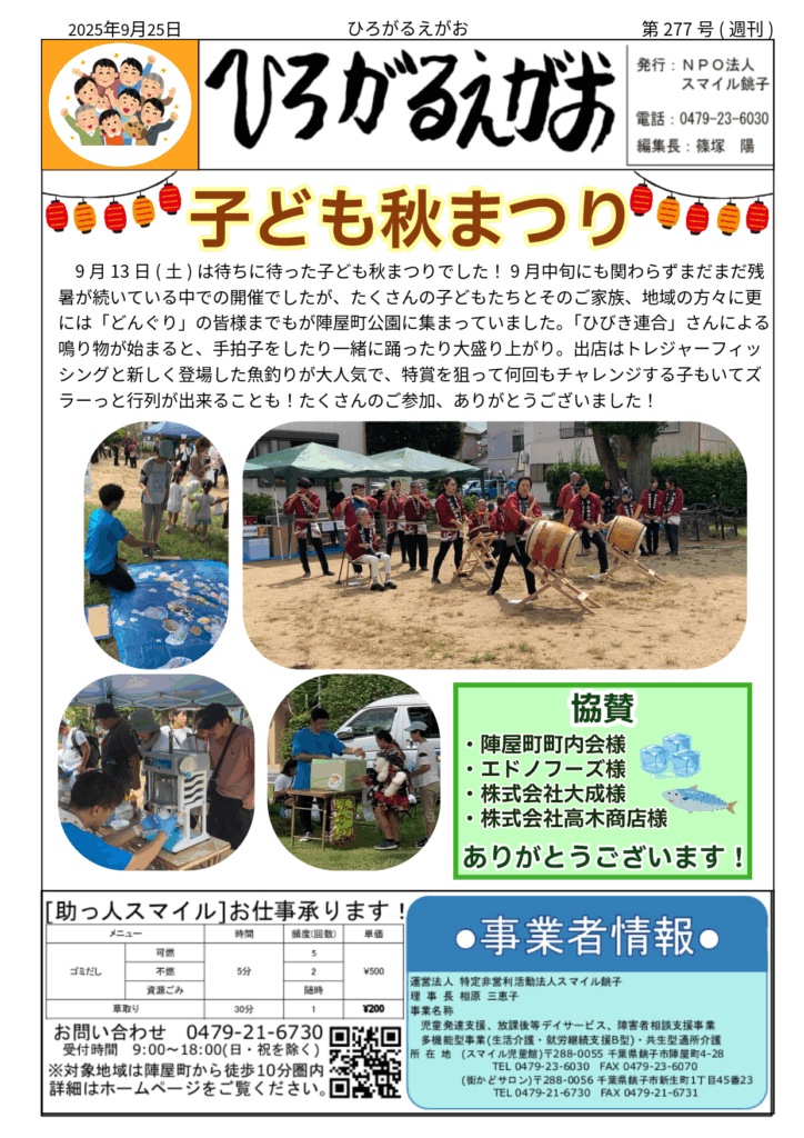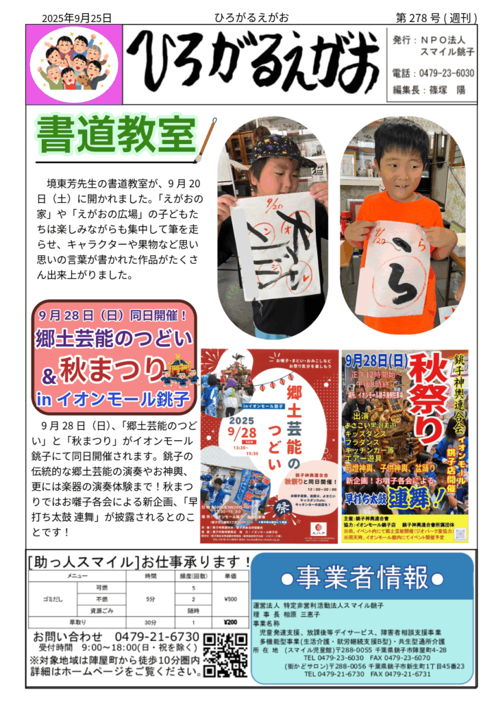 「ひろがるえがお」277、278号 投稿日: 2025年9月25日2025年9月24日 投稿者: スマイル銚子 かわら版「ひろがるえがお」275、276号です!ご一読くださ~い! ⚫︎277号 ・子ども秋まつり ⚫︎278号 ・書道教室 ・郷土芸能のつどい&秋まつり