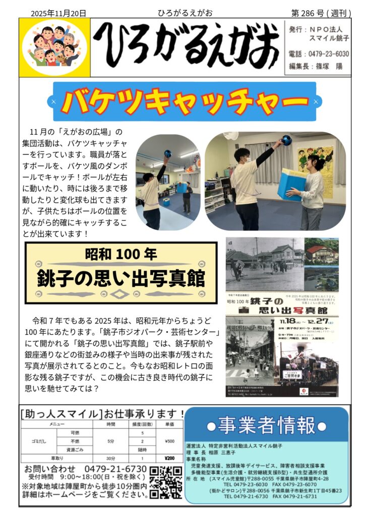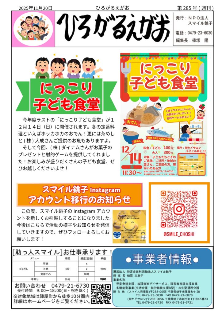 「ひろがるえがお」285、286号 投稿日: 2025年11月20日2025年11月19日 投稿者: スマイル銚子 瓦版「ひろがるえがお」285、286号です!ご一読くださ〜い! ⚫︎285号 にっこり子ども食堂 Instagramアカウント移行のお知らせ ⚫︎286号 バケツキャッチャー 銚子の思い出写真館