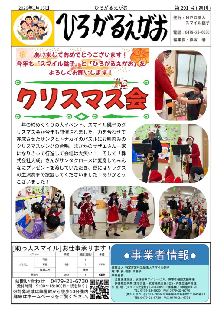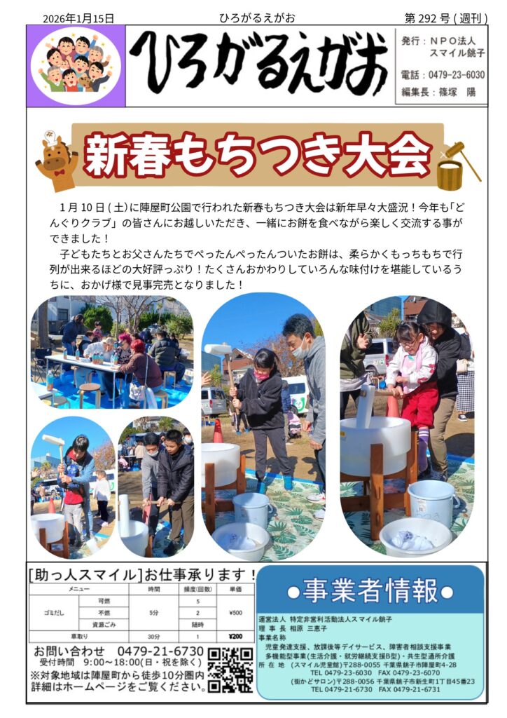 「ひろがるえがお」291、292号 投稿日: 2026年1月15日2026年1月14日 投稿者: スマイル銚子 瓦版「ひろがるえがお」291、292号です!ご一読くださ〜い! ⚫︎291号 クリスマス会 ⚫︎292号 新春もちつき大会