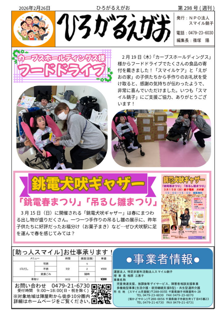 「ひろがるえがお」297、298号 投稿日: 2026年2月26日2026年2月25日 投稿者: スマイル銚子 瓦版「ひろがるえがお」297,298号です。ご一読くださ〜い! ⚫︎297号 焼きそば作り ⚫︎298号 カーブスホールディングス様のフードドライブ 銚電犬吠ギャザー